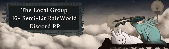 A Rain World roleplay established on July 21st, 2023!Featuring both sides of Rain World roleplay- iterator and creature. Enter an active, moderated community with other talented roleplayers and scug enthusiasts! Owning and playing the game is not required, though a basic understanding of the lore might help a little with the onboarding.The events of Downpour are canon in TLG, while the events of the Watcher are not. Spoilers for the basegame and both DLCs are to be expected. We are currently in the Survivor era.The Local Group is a 16+ server due to the heavy subjects that Rain World often tackles. Additionally, a basic understanding of grammar and the ability to write a paragraph are required to join the roleplay.Come on down and join us in the Local Group! We don't bite.